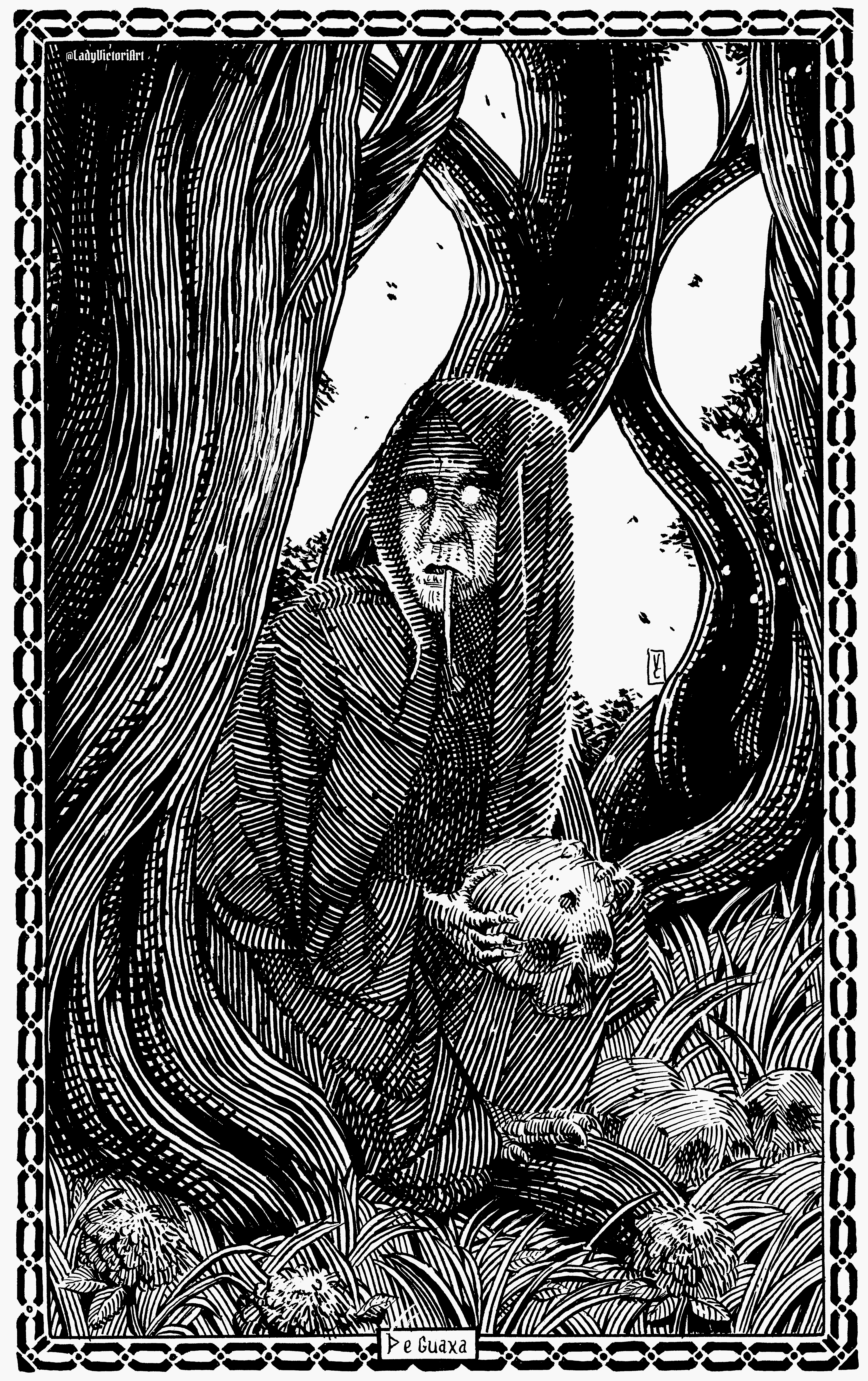 The Guaxa, also called the Guajona, has often been seen wandering the forests of northern Spain, where she has made her home. She appears mostly human but can be distinguished by her bird feet and single long tooth with which she punctures the veins of her victims so as to feast on their blood.