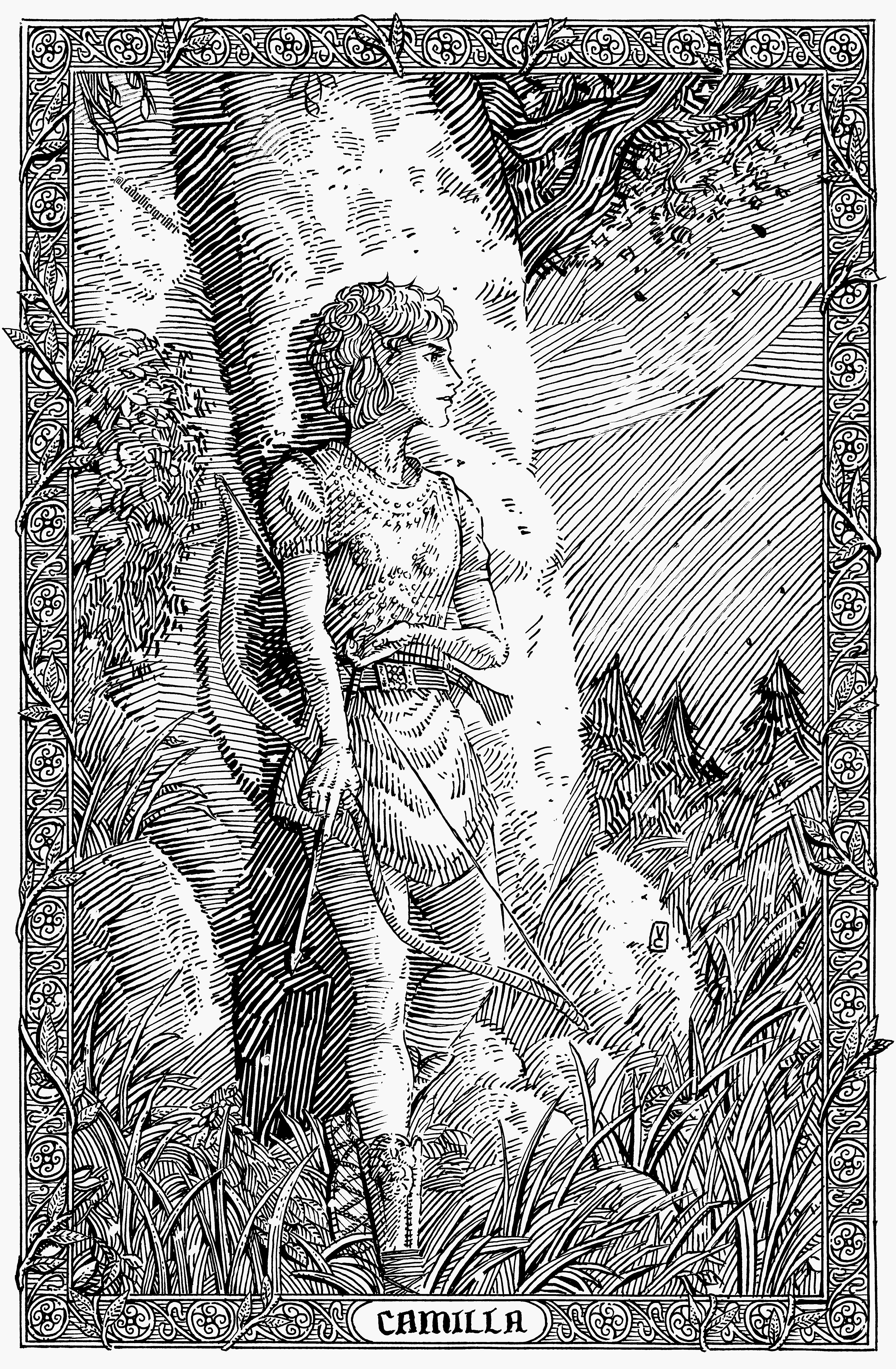 Princess Camilla of the Volsci, a fearsome warrior trained in warfare by the Amazons, aided her ally King Turnus in his war against the Trojan refugees. During the war she was slain by Arruns, a Trojan ally whom the Goddess Diana then killed in revenge.
