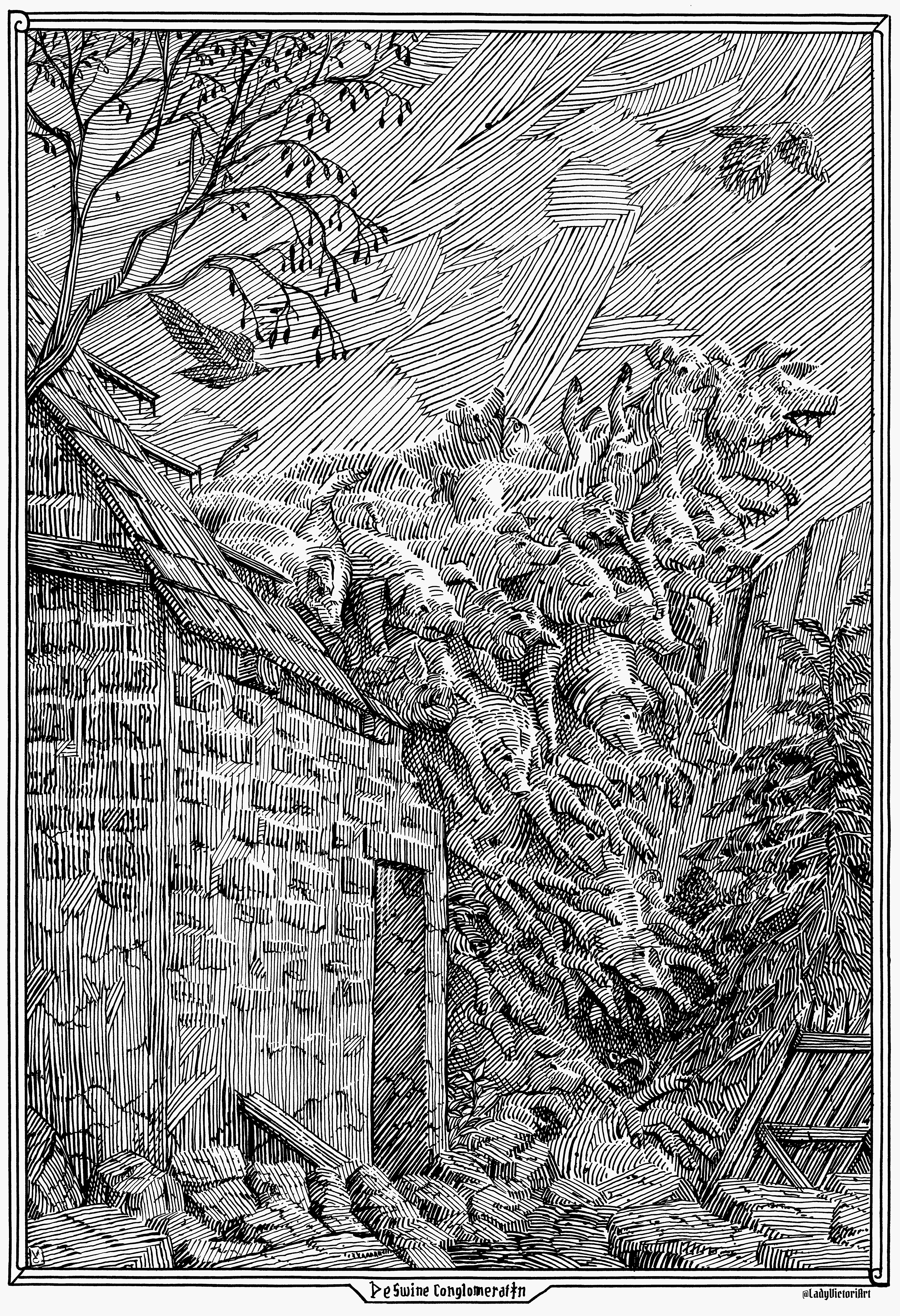 During the years of famine, a peculiar beast made up from the fused bodies of countless pigs was oft sighted. The creature seemed to prefer to avoid humans and was most often seen in the many abandoned towns dotting the landscape.