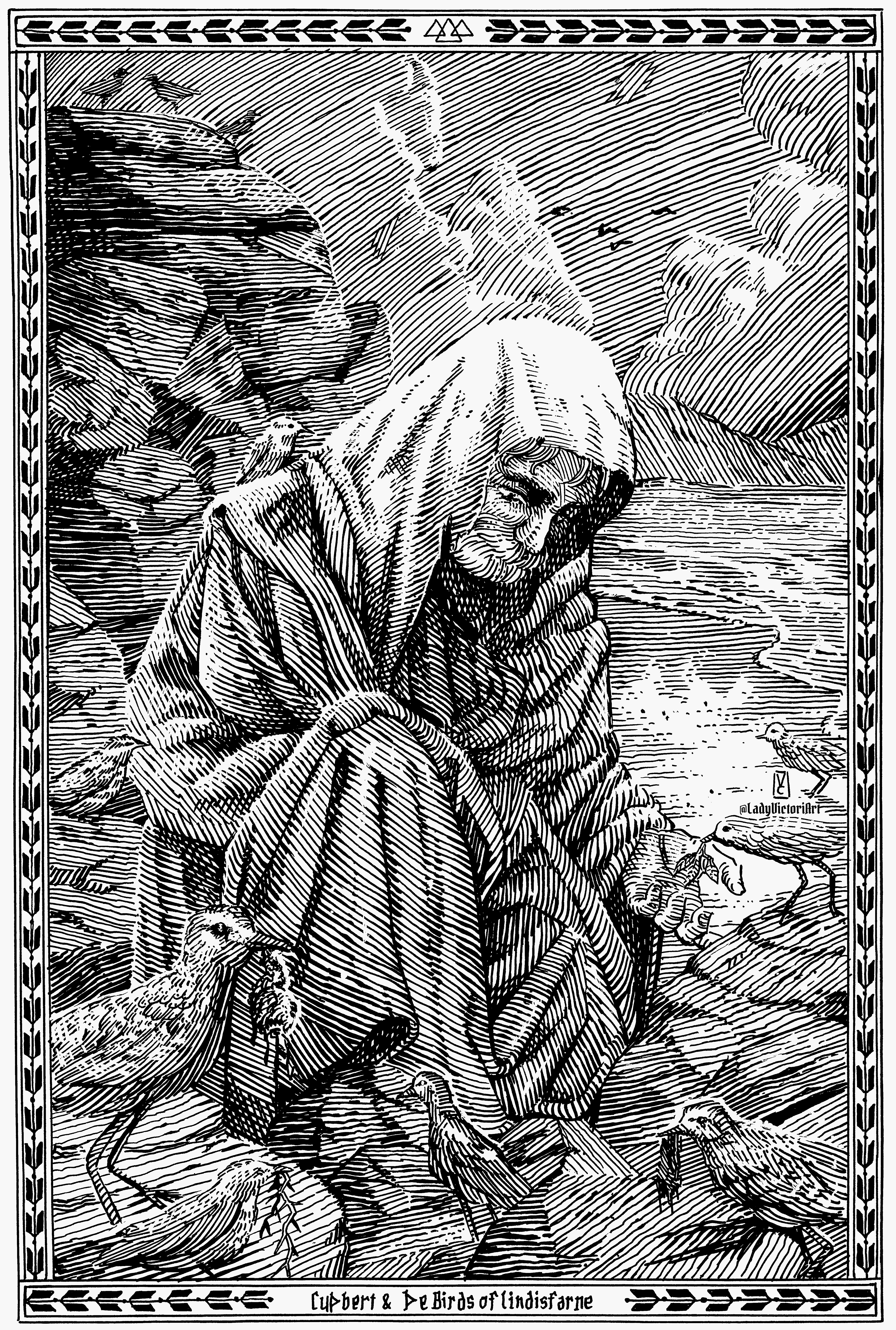 Cuthbert lived as a hermit on a small islet a short distance from Lindisfarne. While there he survived on plants and scraps of raw meat brought to him by the sea birds of the area. After his death he was venerated as a saint.