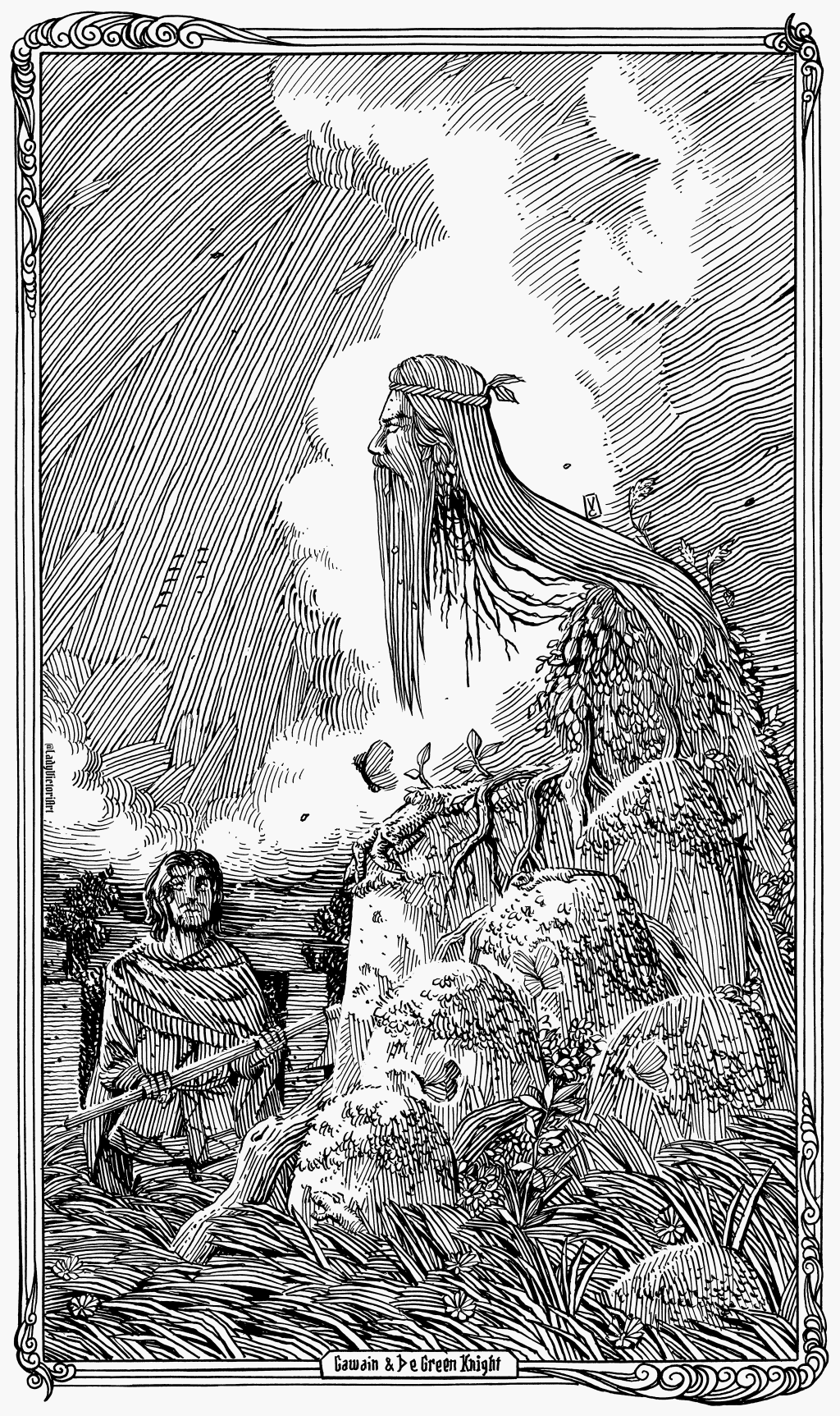 Sir Gawain, the nephew of King Arthur, accepted a challenge from the Green Knight, who dares him to deal any blow on the condition that in a year and a day, the Green Knight may deal Gawain the same blow. Gawain decapitates the Green Knight, who survives, picks up his head, and commands Gawain to seek him out in a year.