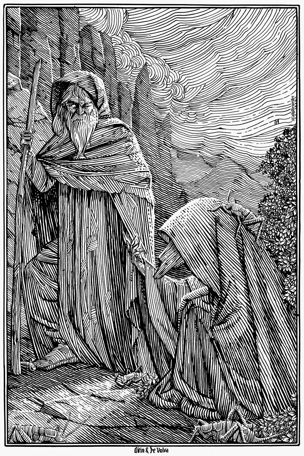 The wandering Odin sought out the Volva, a great prophetess, who related to the all-father the story of the world; the rising of earth from Ginnungagap, its formation from the body of primordial Ymir, and its submersion at the end of Ragnarok.