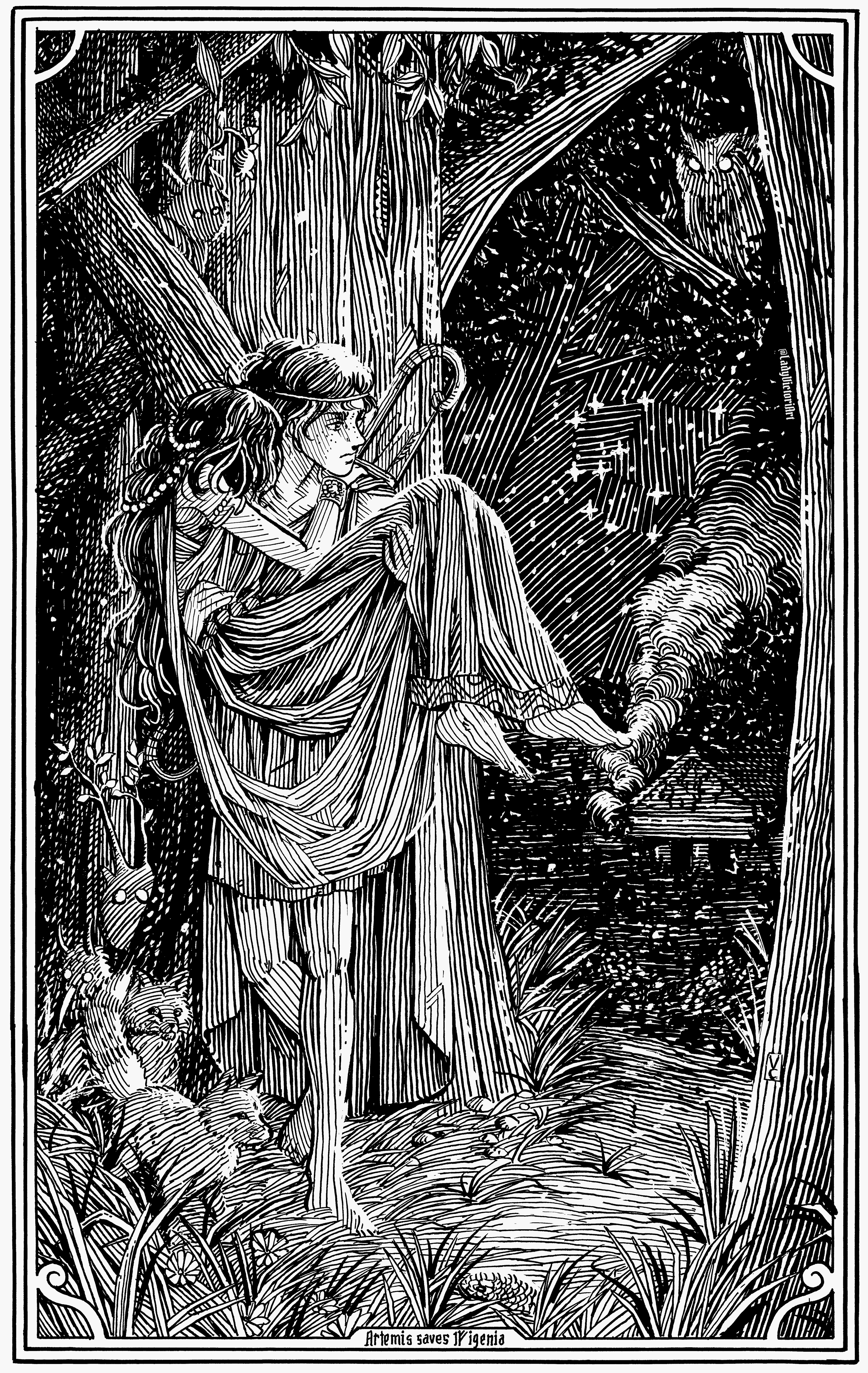 Whilst at Aulis, preparing for war with Troy, King Agamemnon kills a deer in a sacred grove of Artemis, prompting the goddess to send harsh winds, trapping his ships. To appease Artemis, Agamemnon is commanded to sacrifice his eldest daughter Iphigenia. In some tales she is killed, but in others she is saved by Artemis and taken to Tauris to wait out the Trojan war in safety.
