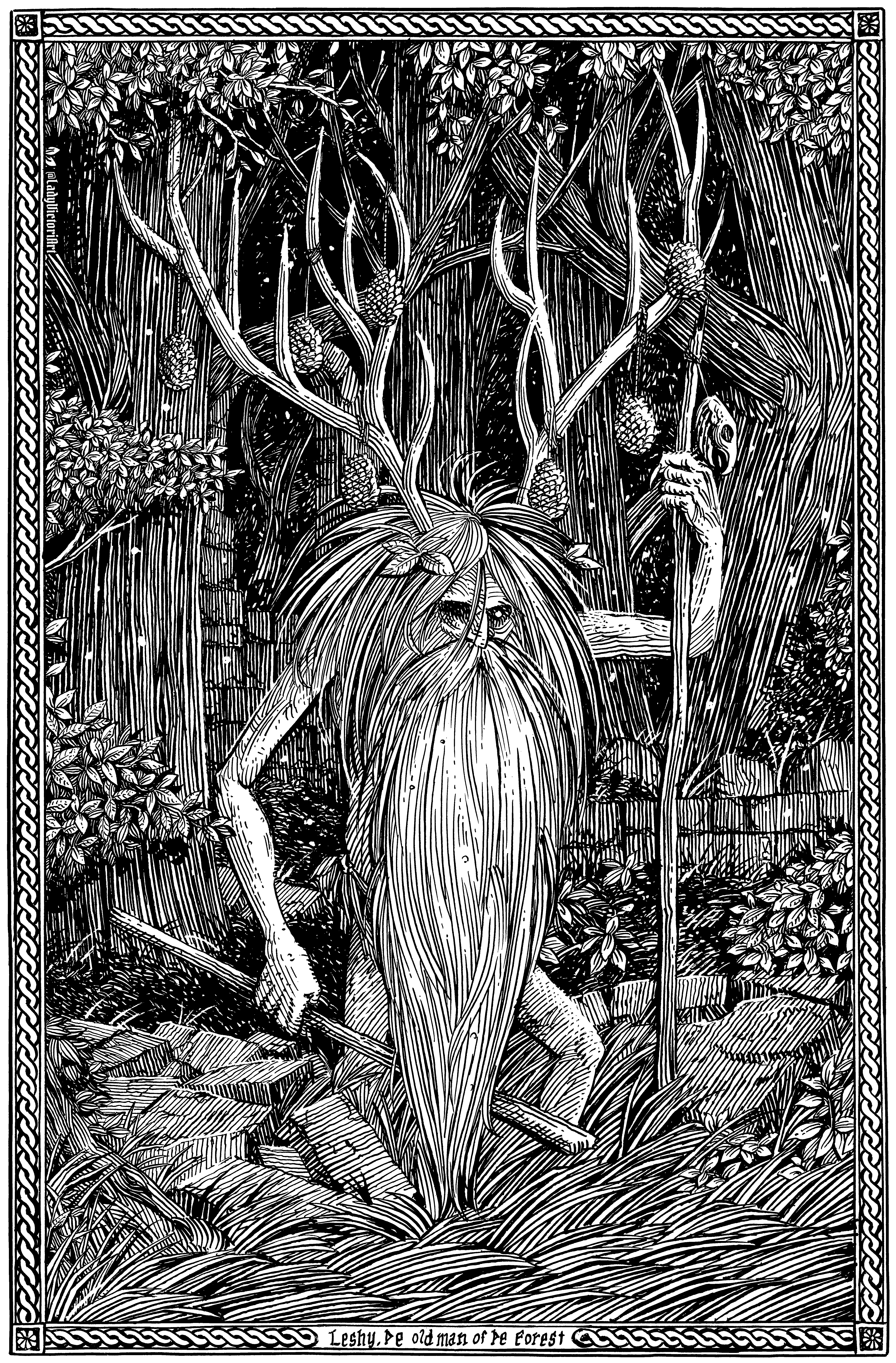 Leshy is an elusive forest spirit told of in Russian folklore. This wild man of the woods was once revered and feared as a powerful deity by the pre-Christian Slavs, but now lives in obscurity. He shuns humankind and is seen little, but is not known to be cruel to the few who encounter him.