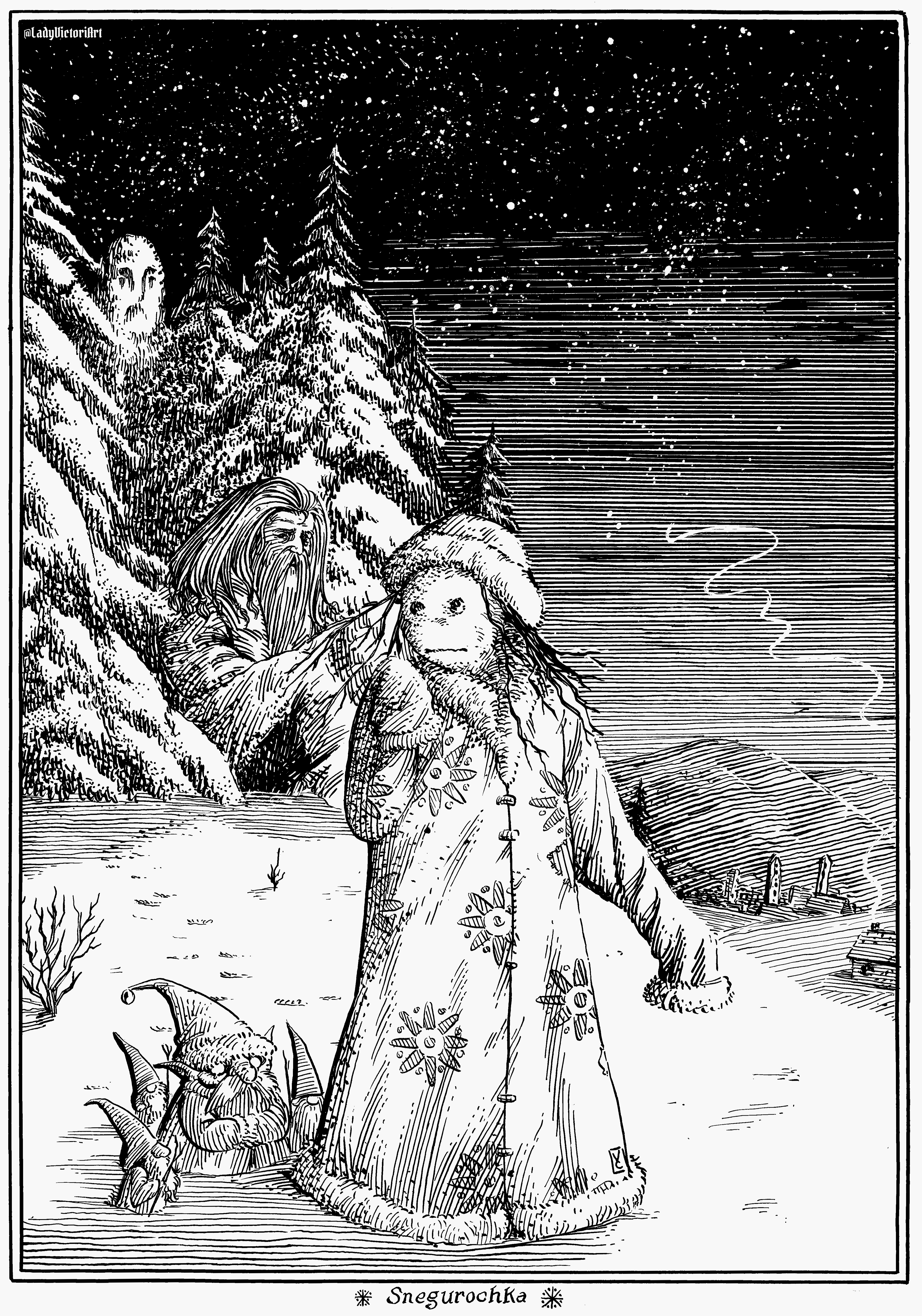 Little Snegurochka, the Snow Maiden, lived in the forest with Father Frost and the fairy-folk. She went to the village to play with the human girls at jumping over a small fire, as is custom on St. Johns Day, but when Snegurochka’s turn came she turned into steam and became a small cloud.
