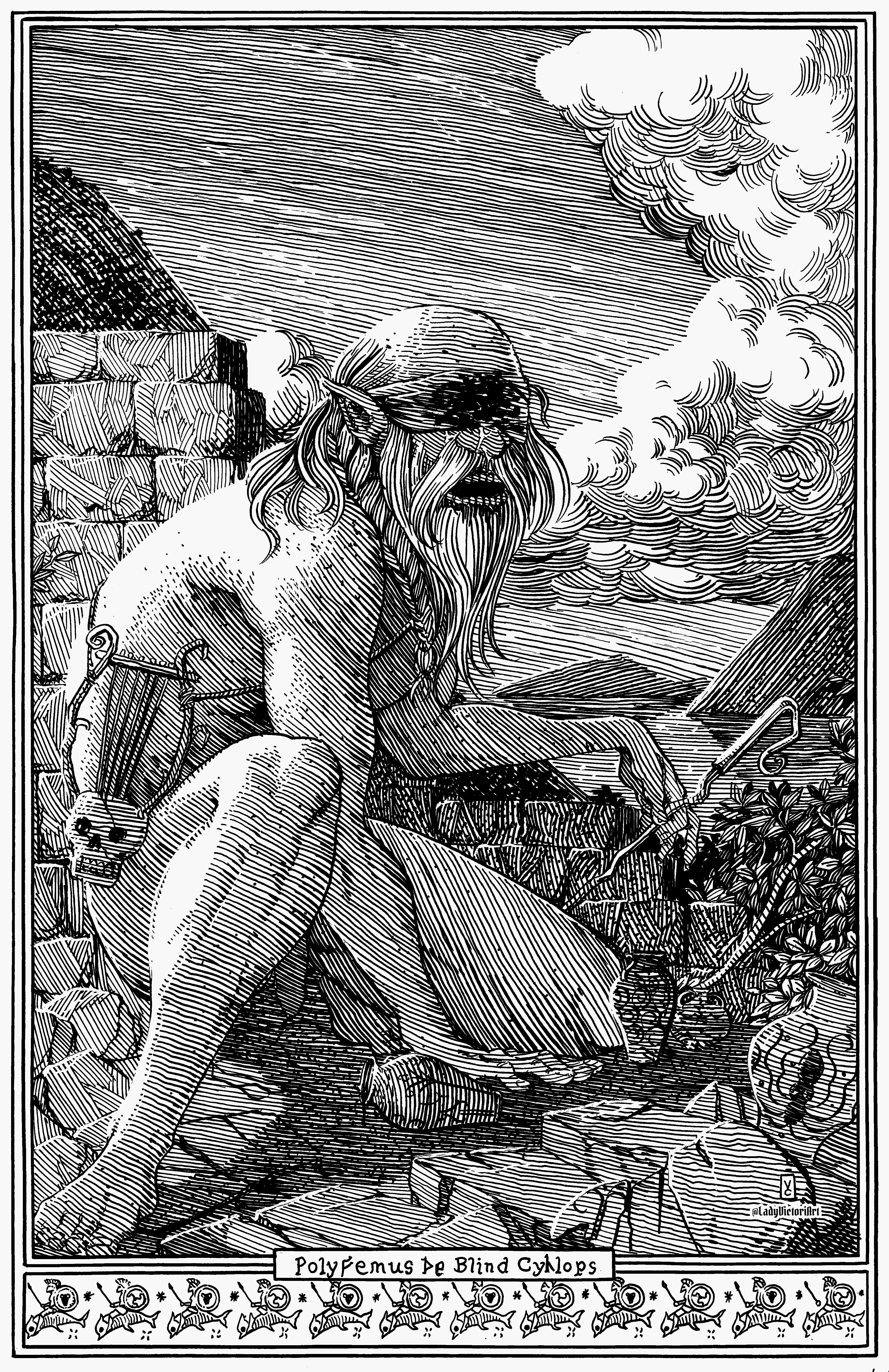 Born to the god Poseidon and the sea-nymph Thoosa, Polyphemus dwelt on the far-off island of the cyclops with his one-eyed kin. He was a dutiful shepherd and skilled lyrist who once tried, and failed, to seduce the nymph Galatea.
