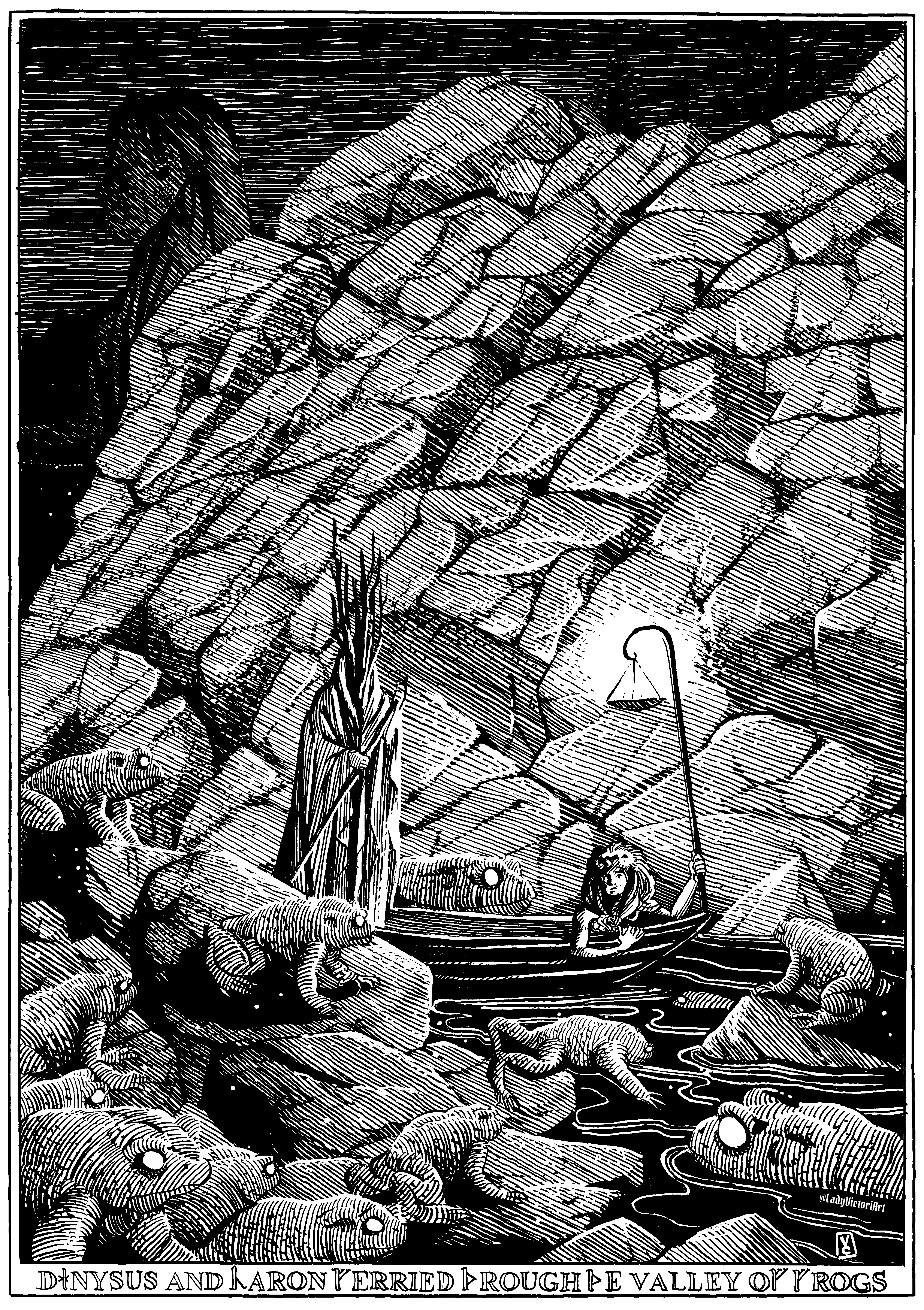 Great Lord Dionysus travelled deep into the depths of Hades disguised as his half-brother Heracles with the aim of resurrecting the playwright Euripides. Charon, the ferryman of the dead, aided him by ferrying him part of the way, but as they neared the shore they were swarmed by the great frogs of Hades. Their rhythmic cry of “Brekekekex-koax-koax” greatly irritated Dionysus.