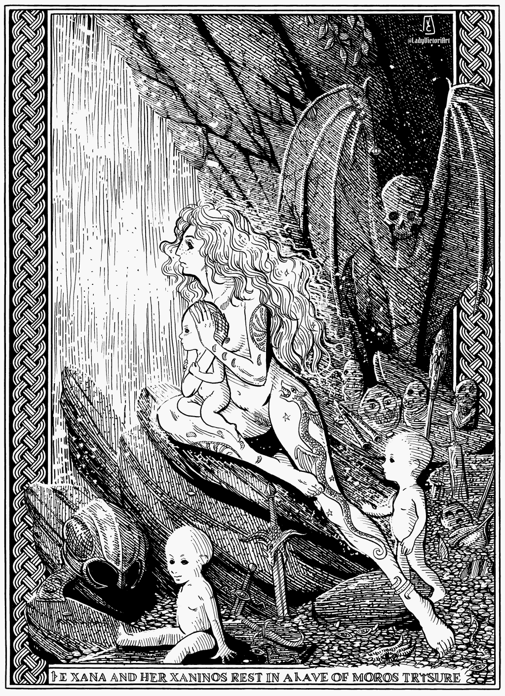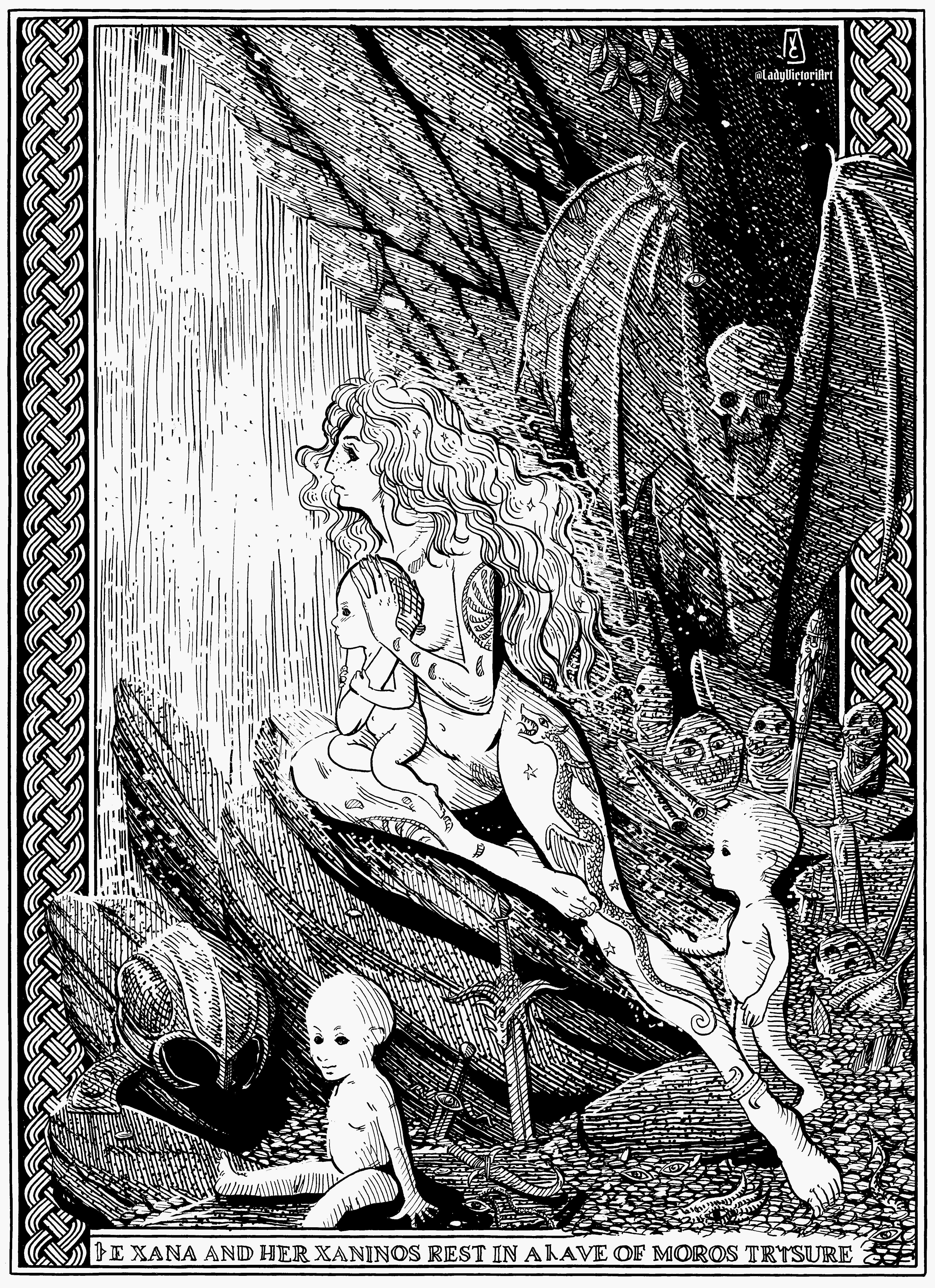 The xana gives birth to young spirits called xaninos. When a xanin is born, the xana wanders from her cave, seeking a human infant to swap with her own. The human mother is left to raise a cursed xanin while, unbeknownst to her, her child is taken away to live amongst the fair spirits and hidden things.